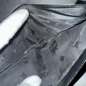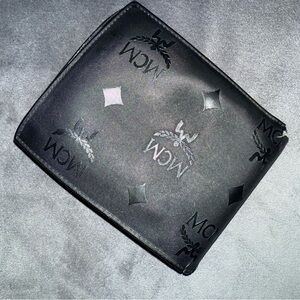 MCM wallet features iconic logo design. Compact and sleek. Corner wear, snap snaps, fair condition overall