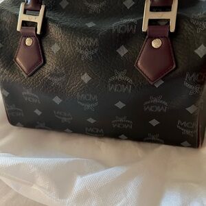 Chic MCM satchel featuring vibrant yellow, green, and orange panels. Elegant black base with signature logo pattern.