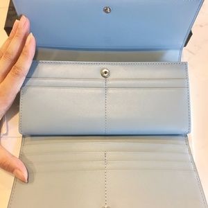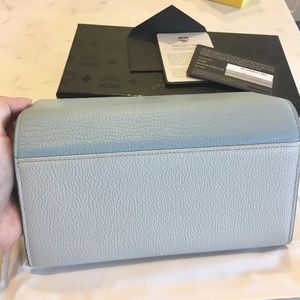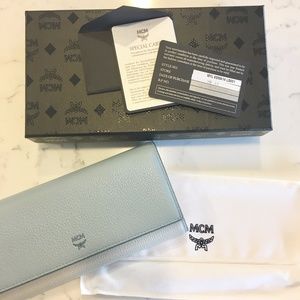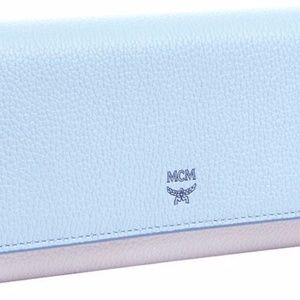 Stamped MCM logo accent the front of this polished, blue and grey threefold flap wallet. Soft pebbled leather, 14 card slots, 3 compartments for bills, zip pocket, and snap closure. Mint condition with no signs of wear/use. Original packaging included.