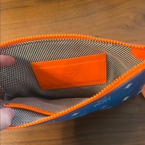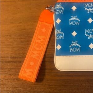 Stylish MCM pouch featuring a blue and white design with an orange strap. Perfect for carrying essentials.