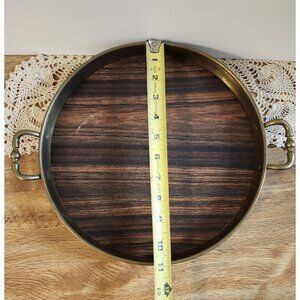 MCM Brass Handled Tray Faux Wood Laminate 11" Round Vintage