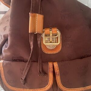 Brown nylon and leather trim backpack. Some fading on hardware and stains in leather trim, see pics. Body had no tears or stains.