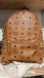 Stylish MCM backpack in cognac. Features gold studs and iconic logo pattern. Ideal for daily use.