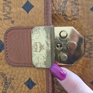 Elegant MCM leather wallet. Features signature logo design. Gold-tone clasp adds a touch of luxury.