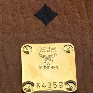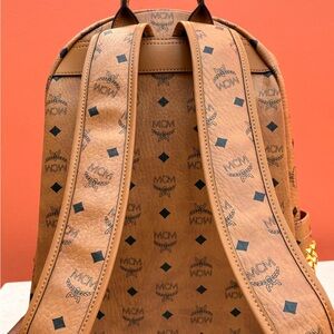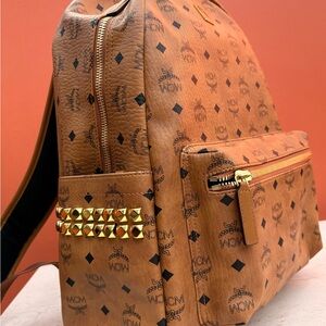 Stylish MCM backpack with iconic logo pattern. Features a front zip pocket and adjustable straps. Ideal for everyday use.
