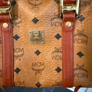 Elegant MCM crossbody with signature logo pattern. Features rich cognac and red tones. Ideal for versatile styling.