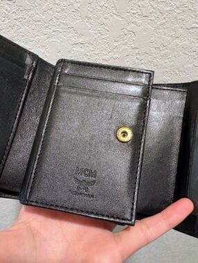 This beautiful black leather MCM compact wallet is in great pre-loved condition with very minimal wear! She's the perfect size for mini's or crossbody bags! The white tag is shown and indicates she's made in Korea. Please look at all the pictures as they are part of the description!!