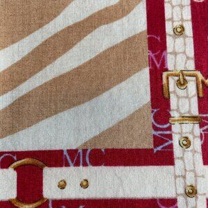 Features: Bold beige and cream zebra stripe center framed by a red border with MCM logo and gold-tone belt buckle motif accents