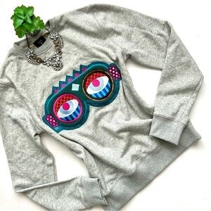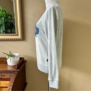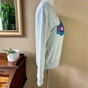 This MCM Craig & Karl 'Beyond Snowdome' Sweatshirt in light gray features multi-color ski / snowboard goggles eyes in a raised embroidered applique in shades of pink, teal green, blue, red, orange, and white with a C&K logo at the side. This piece has a crew neckline, soft knit with terry inside, and ribbed trim. Missing fabric and size tag but I understand it's 85% cotton, 15% poly