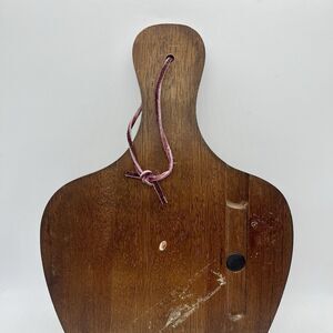 This is a mid century modern cheese cutting board made by Fred Roberts. Has a leather string for hanging and magnetic spot in the back to hold a knife. Wood and tile have damages as pictured, measures about 10x8.
