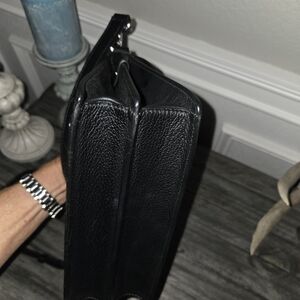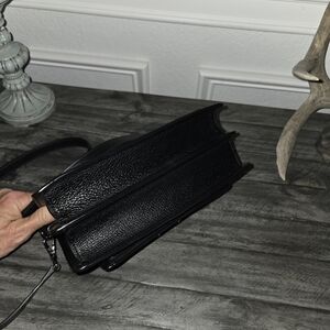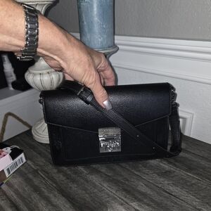 This stylish MCM black leather crossbody bag is perfect for any occasion. Its sleek design and high-quality material make it a must-have accessory. The silver hardware adds a touch of elegance. outside slip pocket. No call outs like new.