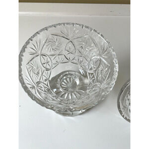 MCM Etched Lead Crystal Footed Pedestal Bowl with Lid 10.5 Inches Tall. This piece is heavy. This item shows minor wear consistent with age and use. There is a chip on the outer rim of the bottom pedestal. Otherwise, a beautiful piece to be displayed. Additional cleaning/polishing may be required