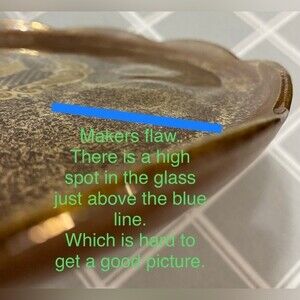 See photos: This is a gorgeous signed footed platter, but very difficult to get excellent pictures showing the beauty of it to clearly come through. There are two pics with notes of flaws, a scratch and what I would describe as a raised “bump” which was also difficult to show in a picture.
