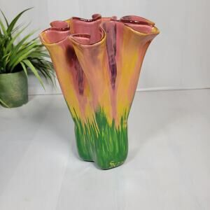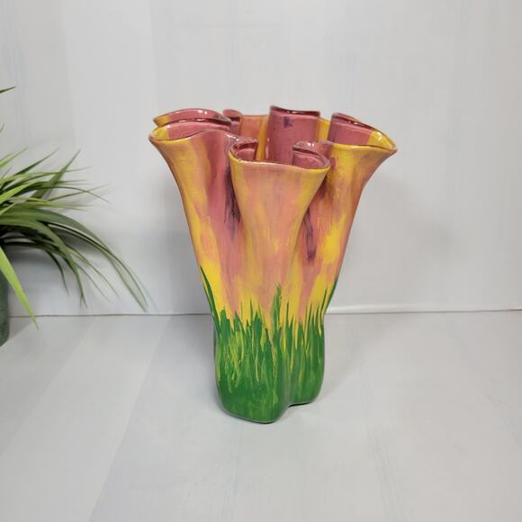 MCM Glass Vase, Handkerchief Style, Ruffle Top Hand Painted Spring Decor