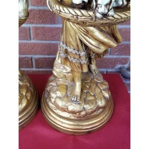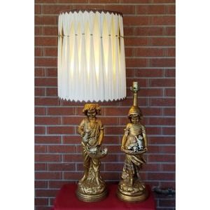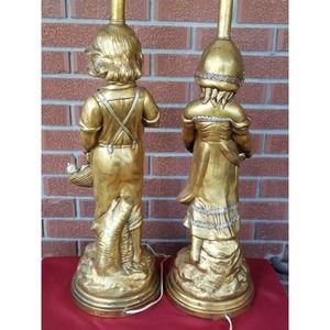 MCM Gold Gilt Chalkware Boy With Kittens Girl With Puppies Lamp Set