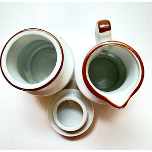 MCM Handgemalt Stoneware Creamer and Sugar Canister Vintage Brown Floral. No chips, cracks or crazing. Paint and gloss are Great. These are Beautiful as a Creamer and Sugar. The floral paint is so soft. How CUTE to use as a MATCH HOLDER, Plant holder, Desk Accessory Storage. Or Bathroom Storage.