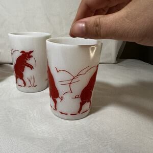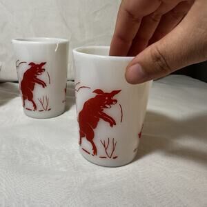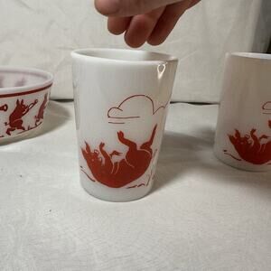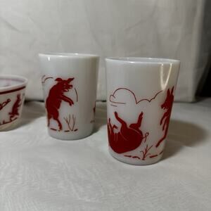 MCM Hazel Atlas Milk Glass 4 Childs Cups 1 Bowl Farm Animals Red & White
