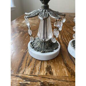 These mid-century modern Hollywood Regency-style candlestick holders feature an elegant design with brass detailing, crystal dangles, and a marble base. Their vintage charm adds a sophisticated touch to any decor, making them a beautiful centerpiece.