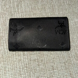 MCM nylon & leather logo print keychain key holder. 3 key hooks, snap closure. Wear is pictured; in good overall condition.