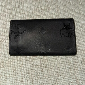 MCM nylon & leather logo print keychain key holder. 3 key hooks, snap closure. Wear is pictured; in good overall condition.