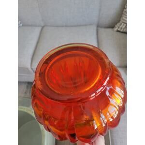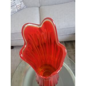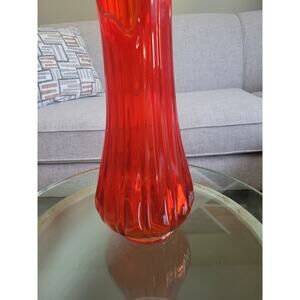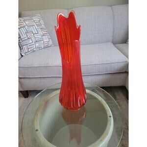 MCM Large L E Smith Vase, Red Stretch Swung, Ribbed Clear Rim, 19-7/8"