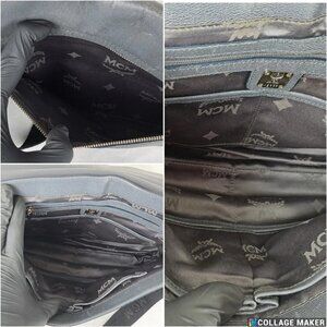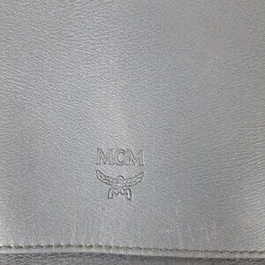 This MCM Leather Shoulder Bag is a stylish and functional accessory suitable for travel, workwear, or business use. It features a magnetic closure and adjustable cross-body strap in black with silver hardware accents. With a large size, it can fit laptops up to 15". The bag has inner pockets, a logo pattern, and a gray canvas lining. Perfect for unisex adults, this sophisticated shoulder bag is a versatile choice for everyday use.