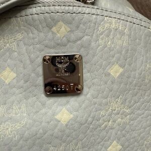 Used designer MCM light blue backpack with MCM pattern. Features front zip pocket and top handle.