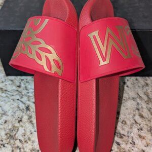 MCM Men’s Large Logo Slides Ruby Red Gold Size 42 EU / 9 US With Box & Dust Bag