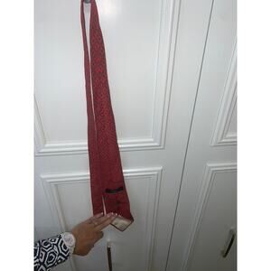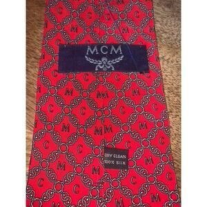 Keywords: MCM tie, red silk tie, men's fashion accessory, geometric pattern tie, luxury men's tie, French-made tie, classic width tie, adjustable silk tie, fashion theme tie, men's luxury fashion, pre-owned men's tie, silk necktie, men's geometric tie, classic length tie, men's red tie