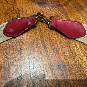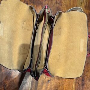 Good condition, gently used, worn leather in places. Measurements are: shoulder strap length is 37 inches, bag height 9.5 inches without straps, with straps bag height is 14.5 inches, bag width is 13.5 inches.