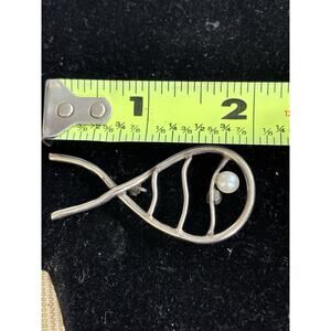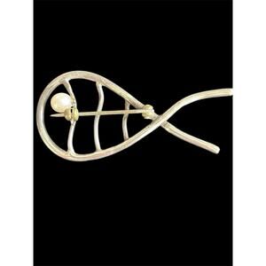 Unmarked MCM abstract fish brooch with freshwater pearl accent. Piece acid tested as sterling silver. 5.0g. Smoke free home. 2” across