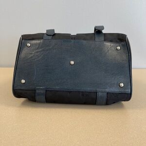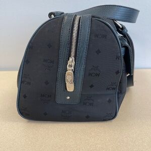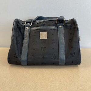 MCM Navy Leather and Black Canvas Boston Handbag w/ Silver Hardware - Preloved