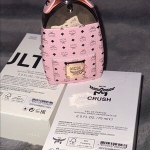 MCM Crush Eau de Parfum in a stylish pink bottle. Perfect for a luxurious scent experience.