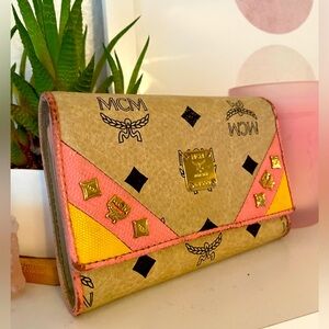 Stylish and vibrant, this MCM wallet features a unique pink and yellow design. Perfect for adding a pop of color to your accessories collection.