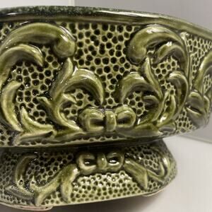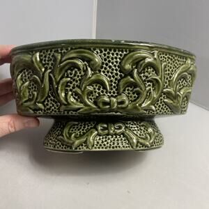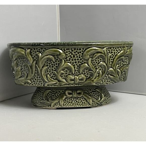 MCM Planter Vase Vintage 1950's Pedestal Ceramic Gloss Green Raised Design