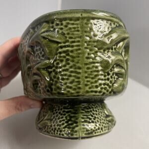 MCM Planter Vase Vintage 1950's Pedestal Ceramic Gloss Green 6” Raised Design