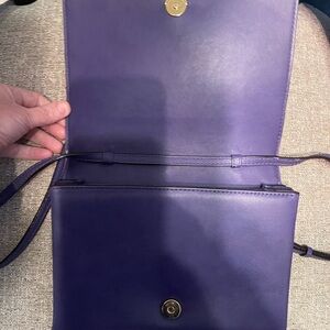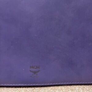 This MCM crossbody bag in a rich purple hue features a structured, rectangular shape with a minimalist design. Crafted from smooth leather, it offers a sophisticated look suitable for both professional and casual settings. The elegant flap closure adds to its understated charm, making it a versatile accessory for any occasion.