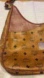 Look at this amazing vintage rare MCM shoulder bag. The strap is adjustable. It has button snaps look good. There's a little robs on the edges so you might wanna put some glazing on it down by the hardware there's rubs on the leather because of the hardware and at the top of the lip of the purse . The hardware has Rob's marks scratches and tarnishing the corners have rubs. I don't really see any stains on it there could be a possible stain. I miss there's some scratches on the reddish brown part that is a packet on the outside inside is clean I don't see any stains. There's no rips no holes no tears. There could be possible lint there could be possible dirt there could be possible glitter. This is a used vintage rare MCM bag so there are signs of wear