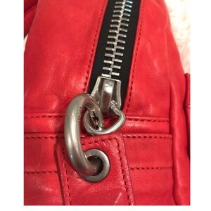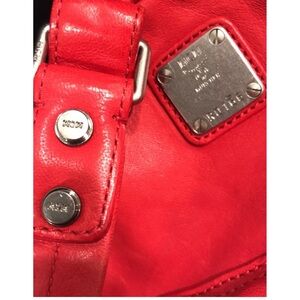 Stylish MCM backpack in vibrant red. Features front zip pocket and adjustable straps. Perfect for everyday use.