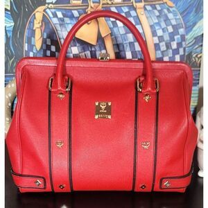 This is an amazing and large red pebbled leather MCM and wallet. It is a beautiful hot red, with black trim and gold accents that add so much to this already fantastically crafted purse! The wallet is not original to the purse, but they make a fantastic couple! Pebbled red leather is sure to make an impressive style statement, no matter what the occasion is. These are super clean, the bag is nylon lined spacious interior which adds to its style and durability. The handles look great with very little signs of use. This bag has an easy open/close clasp on the top and inside has multiple pockets, one with a zipper and two slip pocket - the rest is wide open space and lots of it. Big beautiful bag! Zippy wallet has matching gold hardware and no coin residue, lots of card slots and space.