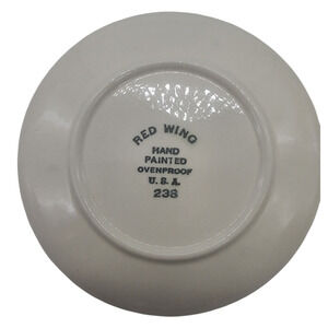 The MCM Red Wing Capistrano DESSERT PLATES are a set of four vintage ceramic plates featuring a textured swallow design that is hand-painted. These round bread plates are from the mid-20th century, specifically the Mid-Century Modern era. Made in the United States using pottery production techniques, these retro plates bear a printed backstamp and are a unique addition to any table setting for those who appreciate vintage decor and collectible pieces.