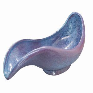 This Mid-Century Modern console planter from Red Wing Pottery showcases an elegant design in purple and pink speckle, embodying the 1950s aesthetic. Its unique shape and color palette make it a striking addition to vintage decor. The piece exudes a timeless charm, reflecting the artistry and craftsmanship of its era.