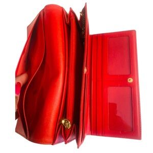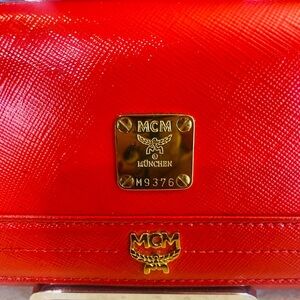 This MCM Red w/Golden Hardware Long Trifold Wallet: M9376 is in Exceptional Used Condition (EUC): Previously lovingly cared for; but this is a preloved (used) item, some normal and minimal wear is expected; beautiful wallet, minor marks throughout, minor wear to hardware, but still very shiny. Depending on device used, color may vary. Review pics as they’re part of the description. Sold as is, no refunds. All auction bids/wins are final, no cancellations.