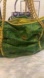 EUC Shoulder tote bag with gold chain wrap with leather strap and a snap top closure. Elevate your style with this stunning green beauty from MCM. Perfect for any occasion, this bag combines elegance and functionality. Maybe a light spa on the leather area and bottom will make this bag more gorgeous. Please review all photos carefully and zoom to see all details and conditions as they are a part of its description before bidding or purchasing. Green exterior material feels pvc with leather trimmings around chain, bottom and opening. Interior looks satin as its soft with MCM logo all around. Strap handle has weight with beautiful gold hardware and leather. Preloved. Please feel free to ask any questions.