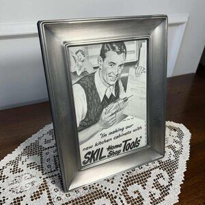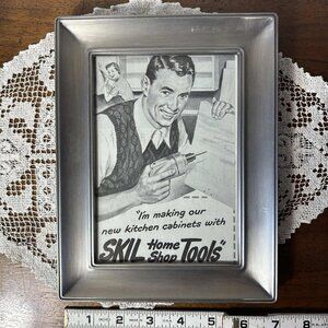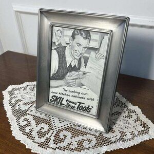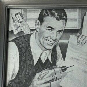 Vintage black and white advertising artwork from an early 1950’s Saturday Evening Post. Framed in brushed aluminum under glass. 7” x 19” of Americana mid century advertising memorabilia. Dad’s holding the hand drill ‘showing off’ his handiwork. I hope he’s not getting ready to drill holding it that way. Mom looks happy, probably because she’s finally getting those cabinet doors after ‘only’ a few months on the ‘honey do’ list! Hard to find treasure from a simpler time.