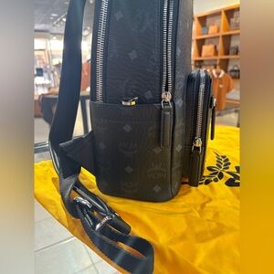 The MCM Stark backpack features the brand’s signature Visetos monogram. This design includes a spacious main compartment, practical pockets, and quality craftsmanship.