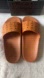 MCM Women slide sandals in tan. Features iconic logo pattern.