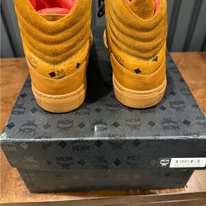 Stylish MCM sneakers with a tan leather upper. Features black laces and iconic MCM logo detailing. Perfect for casual wear.