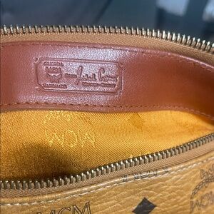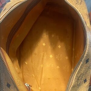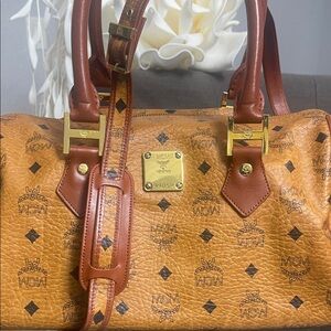 Medium MCM Boston Bag with iconic logo print. Rich Cognac and reddish-brown tones. Stylish and versatile design. Long leather trimmed strap included for crossbody option. Very clean inside.