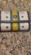 Elegant MCM wallet with a white base with navy blue trim. Features yellow and green stripes. Navy blue on the inside.